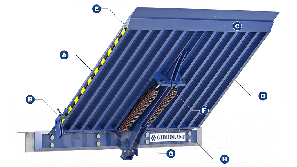 Аппарель перегрузочного моста выполнена из 12-и мм стального листа, направляющий рельс из горячекатанного швеллера 160 мм, а система балансировки основана на 2-х пружинах и роликовой опоре. Окраска порошковая с предварительной обработкой в дробеструйной камере.