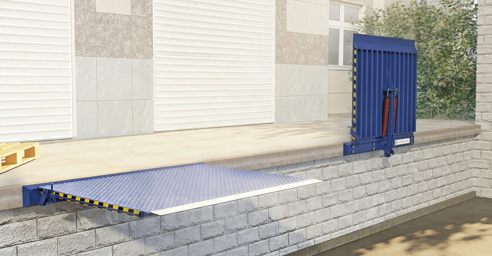 Откидной механический мост предназначен для установки на рампу или пандус и компенсации разницы между уровнем пола склада и кузовом автомобиля до 360 мм в зависимости от модели. При разгрузочно-погрузочных работах с помощью боковой ручки перегрузочный мост откидывается в горизонтальное положение на кузов автомобиля. После проведения перегрузочных работ конструкцию возвращают в исходное положение. Скользящий откидной мост при необходимости может передвигаться вдоль пандуса.