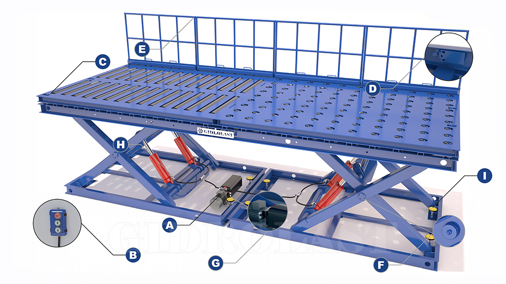 - H. Клапаны безопасности (предотвращение падения платформы в случае потери давления в гидросистеме).