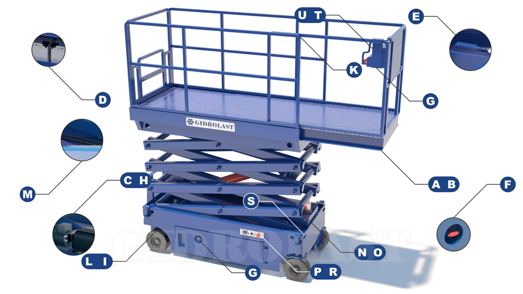 - K. Защитные ограждения защищают подъемник от опрокидывания, при движении в поднятом положении. Складные ограждения. Блокировка дверей на платформе